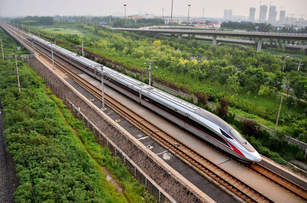 ↑2017年8月21日,从北京南开往天津的C2001次“复兴号”中国标准动车组驶入天津市区。当日起,京津城际列车开行19.5对“复兴号”动车组列车。