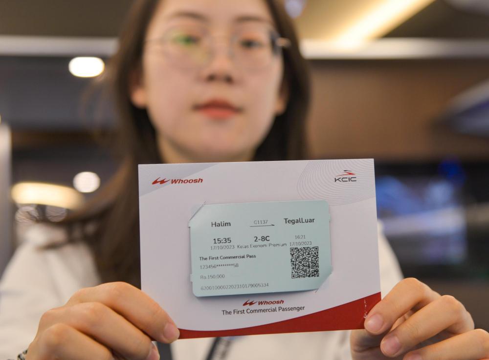 ↑2023年10月17日,乘客在行驶中的雅万高铁高速动车组列车车厢内展示纪念车票。当日,雅万高铁正式开通运营。