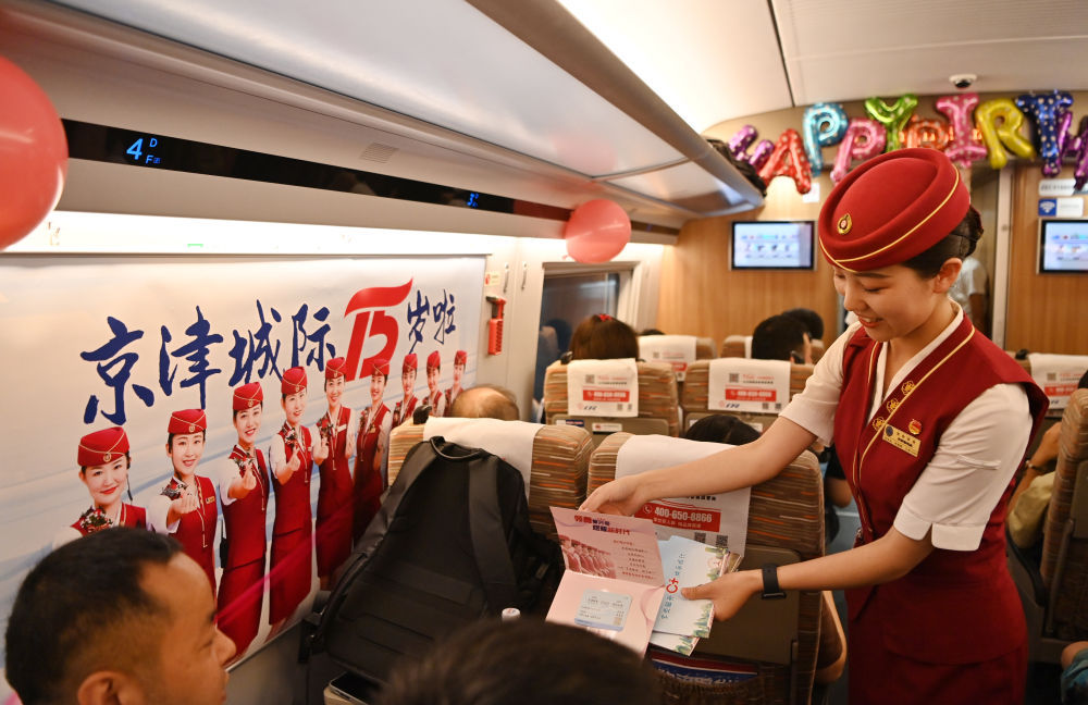 ↑2023年8月1日,京津城际铁路迎来15岁生日,天津客运段的乘务人员在京津城际列车上给旅客发放纪念册。