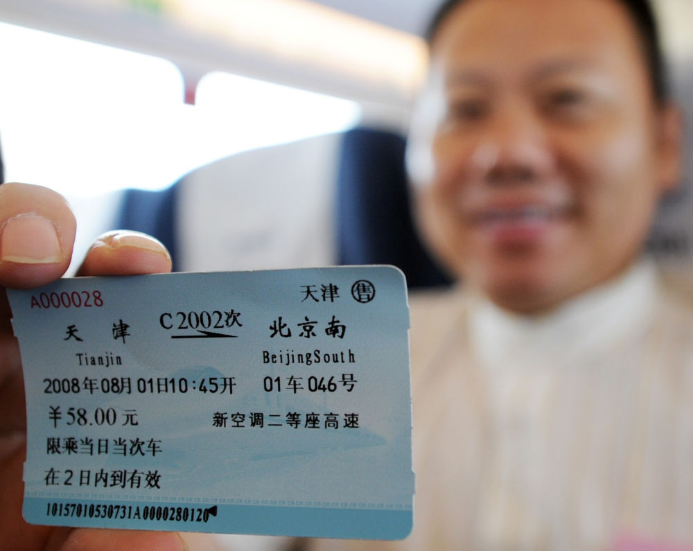 ↑2008年8月1日,乘客在天津开往北京的京津城际列车上展示车票。