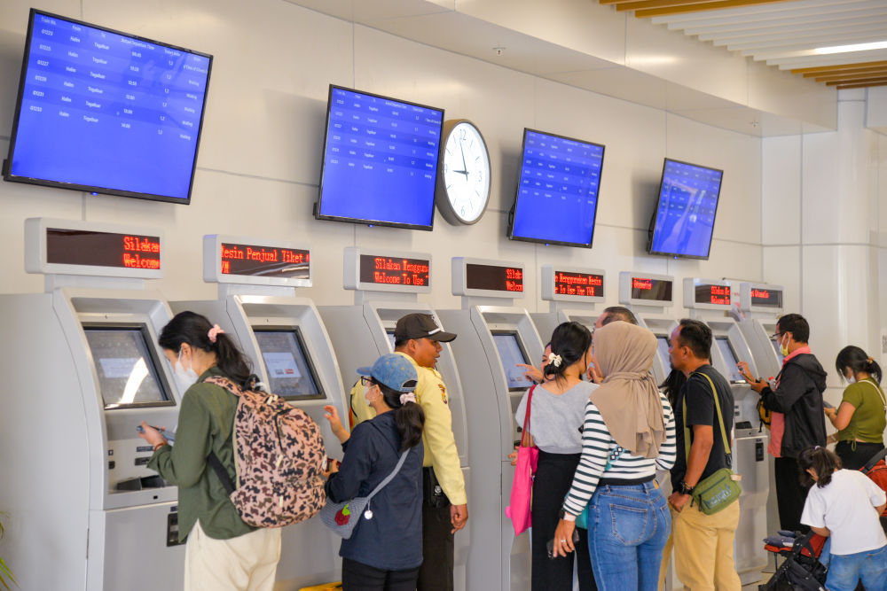 ↑乘客在雅加达哈利姆站的自助取票机前取票。