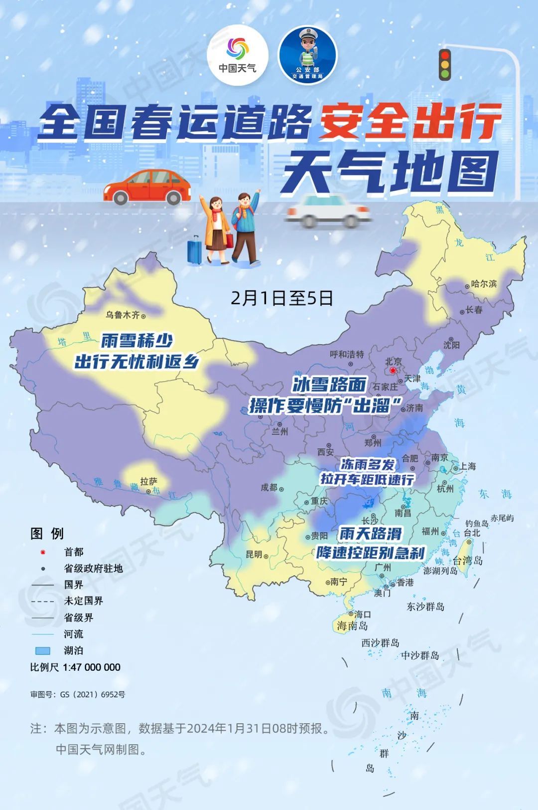 今天夜间起至2月5日,中东部地区关注雨雪冰冻天气对春运交通、城市运行、电力通讯设施、农畜设施和农业生产等的影响。