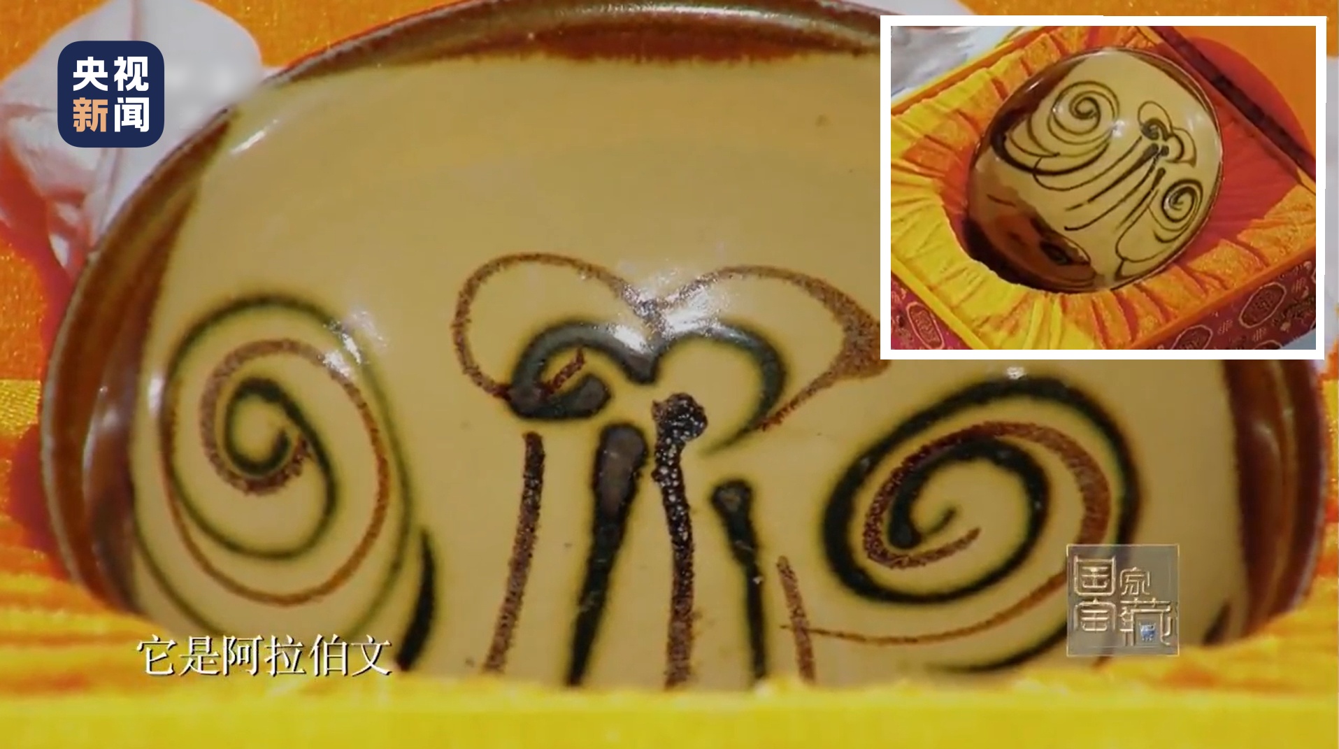 △总台《国家宝藏》节目中展示的长沙窑瓷碗,彩绘内容为当时的阿拉伯文。据节目介绍,这件瓷碗即为“黑石号”沉船上装载的长沙窑瓷器之一。