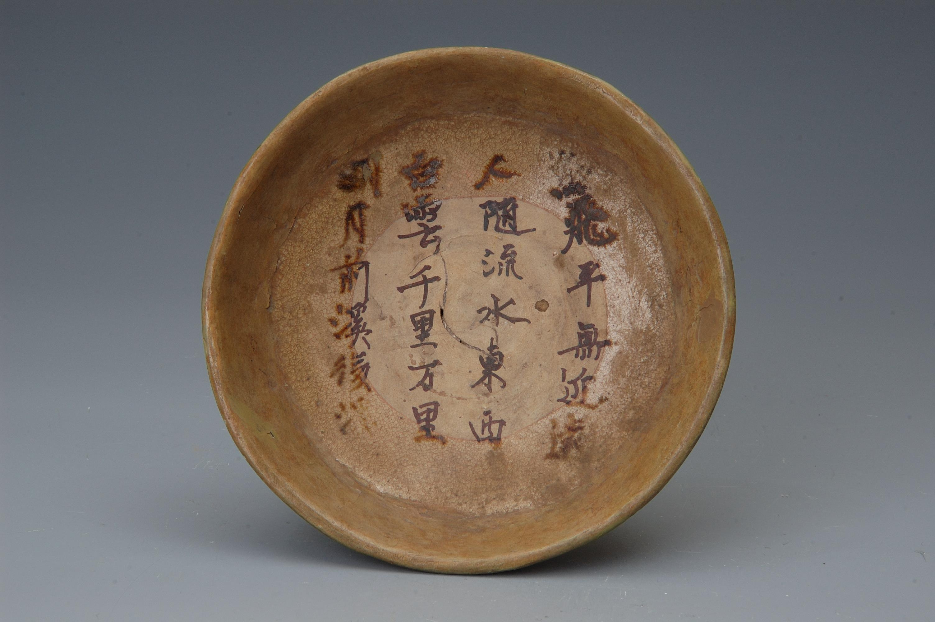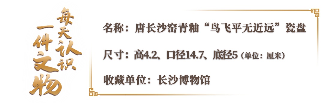 △长沙窑青釉“鸟飞平无近远”瓷盘,圆唇,敞口,折腹,圈足。