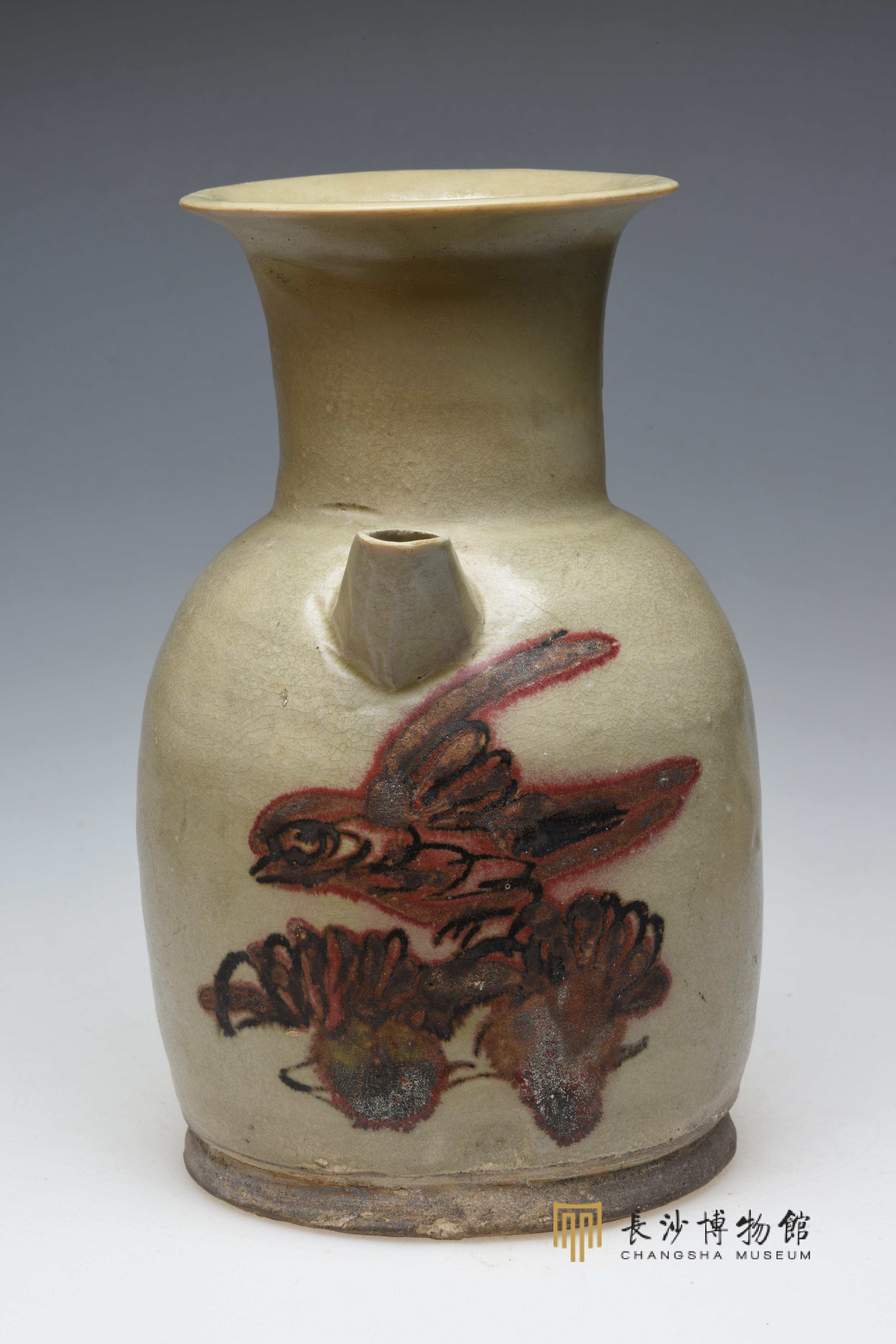 △唐 长沙窑青釉红褐绿彩鸟纹瓷壶
