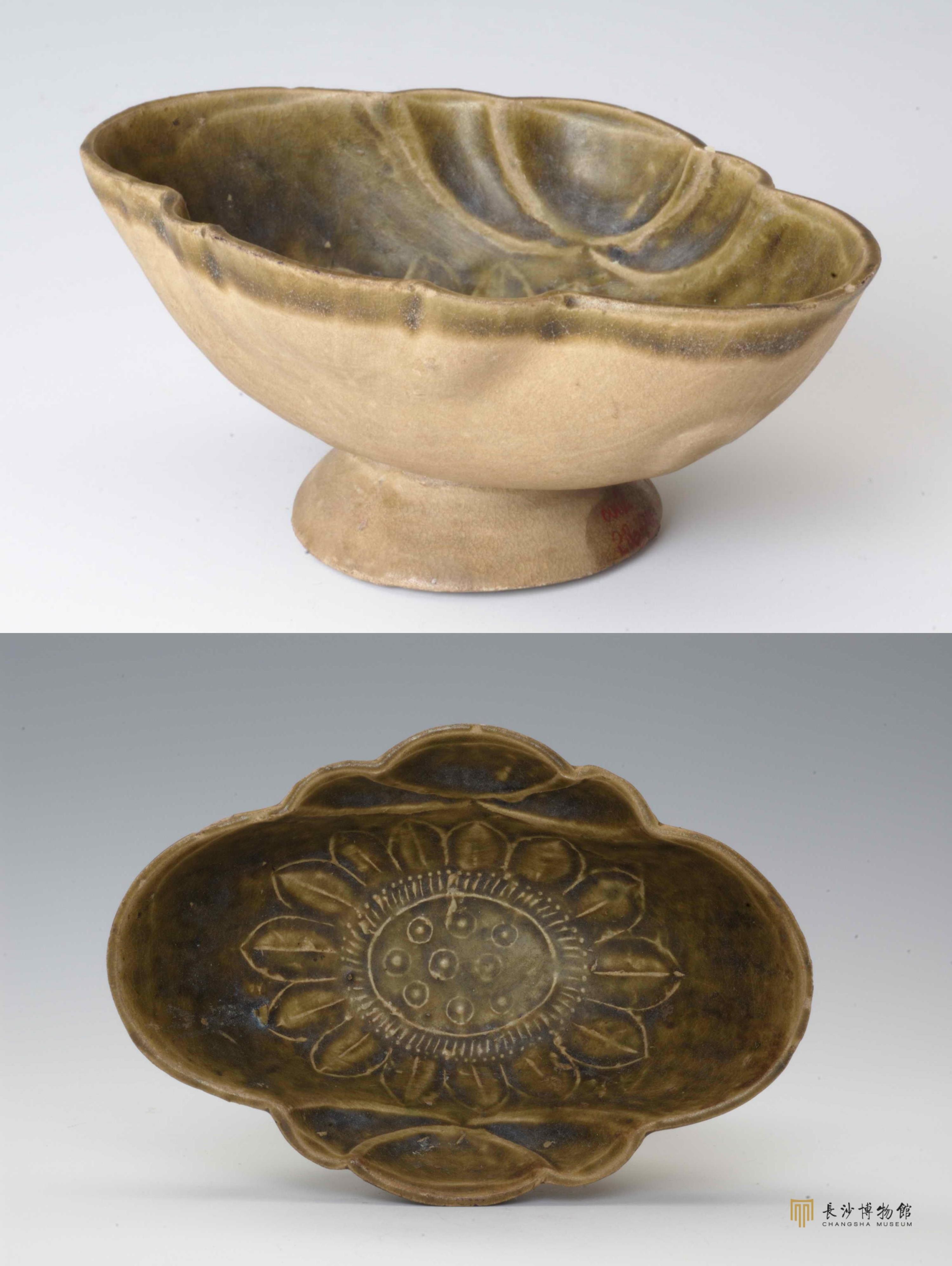 △唐 长沙窑青釉莲花纹高足海棠形瓷杯