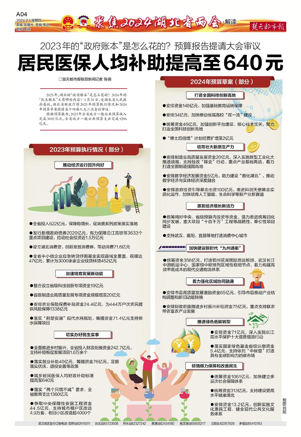 2023年,湖北的“政府账本”是怎么花的?2024年的“民生账本”又有哪些内容?1月31日,受湖北省人民政府委托,湖北省财政厅将2023年预算执行情况和2024年预算草案提请省十四届人大二次会议审议。