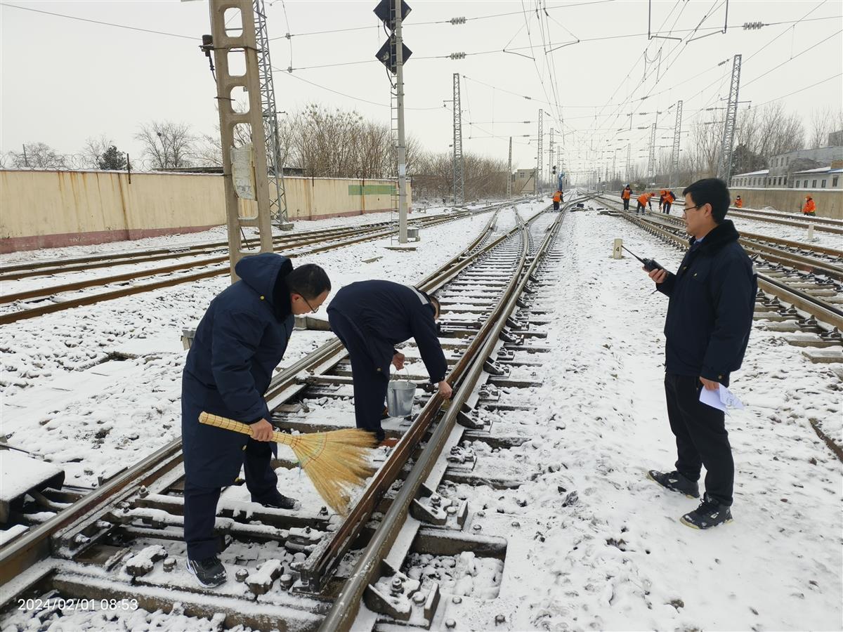 1日起,武铁管内襄阳、宜昌、漯河、平顶山等区域迎来大范围雨雪天气,武铁及时启动应急预案,2000多名除冰扫雪人员24小时上岗随时扫除积雪,各单位全面排查设备设施确保使用良好。武汉高铁工务段提高对道岔绝缘接头、道岔联结零件等七项关键设备状态开展全覆盖检查,武昌南机务段重点对121台机车走行部、制动系统、保护装置等关键项点进行记名式检查整治。武昌车务段、驻马店车务段、平顶山东站等单位安排人员及时清理线路积雪,为道岔涂抹防冻油,确保铁路运输畅通。