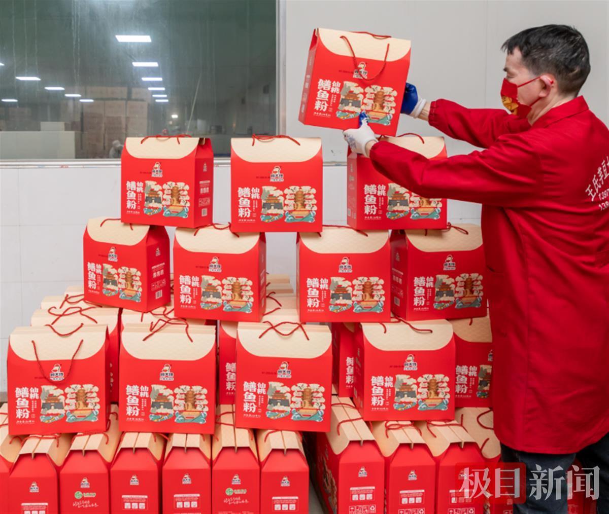 在湖北顾大嫂食品有限公司生产车间,工人正在分拣打包速食类仙桃鳝鱼粉,生产出的一箱箱鳝鱼粉被贴上快递单,装进物流货车,准备发往各地。该公司负责人接受采访时表示,春节临近,该公司专门安排1条生产线赶制速食类“仙桃鳝鱼粉”,提前备货2万件,计划在仙桃宾馆、酒店、超市全面铺货,线上直播同步推广,将仙桃传统美味推向全国。