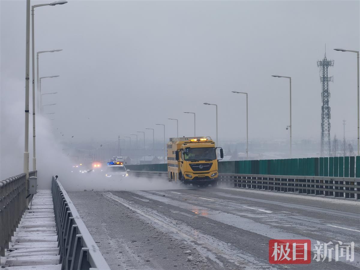 2日清晨6时,二广高速荆州段迎来冻雨,荆州长江大桥结冰,影响长江两岸群众及民生保障物资车辆出行。湖北高警公安大队联合养护部门,使用涡喷吹雪车不间断开展除雪作业。针对桥南、桥北滞留群众,大队民警联动路政单位,前后组织4波次警车带道,引导近千台车辆平安过桥跨江。