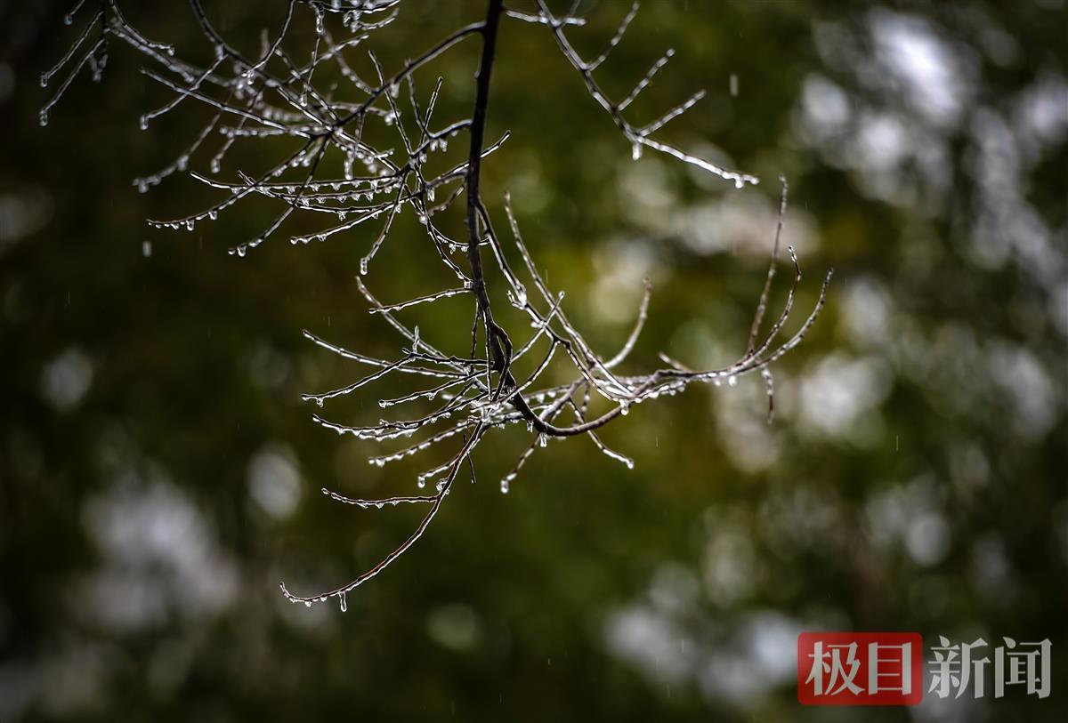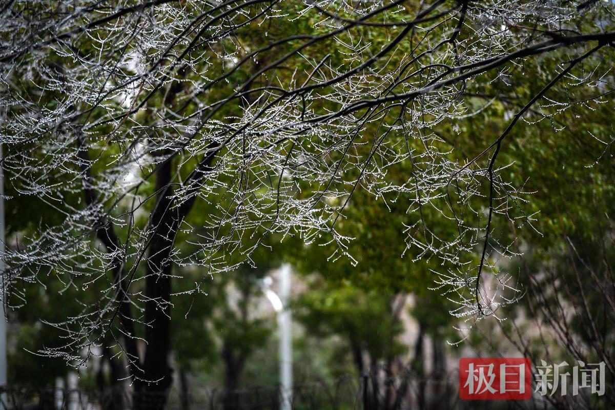 2月2日,江城武汉雨水绵绵,气温骤降。也正是雨水和降温的双重影响,给一些光秃秃的树枝上挂满冰花。