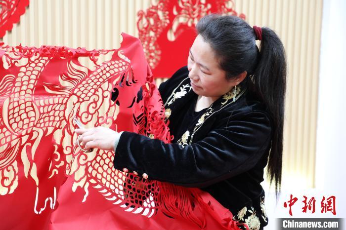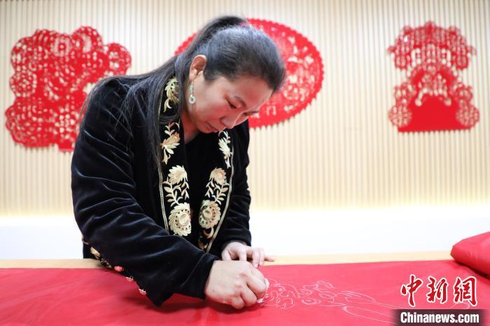 2月2日,李娜正在认真查看初步成型的服装剪纸作品。刘延岭 摄