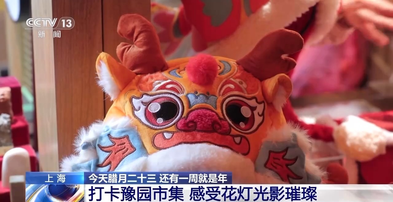 总台记者 刘潇凡:走过九曲桥,穿过老街集市,就来到了豫园最佳的打卡点,一夜鱼龙舞灯组,400多盏小鱼灯组成的一条游龙。在这条巨型灯组下面就是非常长的民俗集市,集市上有迷你的铜艺、软陶、中国结、香袋等。今年是龙年,里面有很多龙元素商品,有龙造型的香囊、龙形的小摆件。在集市上,过年家里门上贴的、墙上挂的可以说是应有尽有,除了这些传统的老年货,年里大集也创新推出了许多潮流的新年货,比如说有卡通造型的龙帽 ,还有造型非常可爱的龙灯。