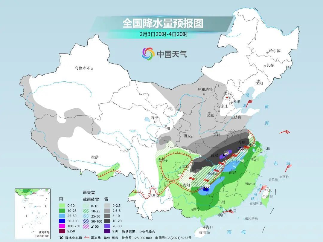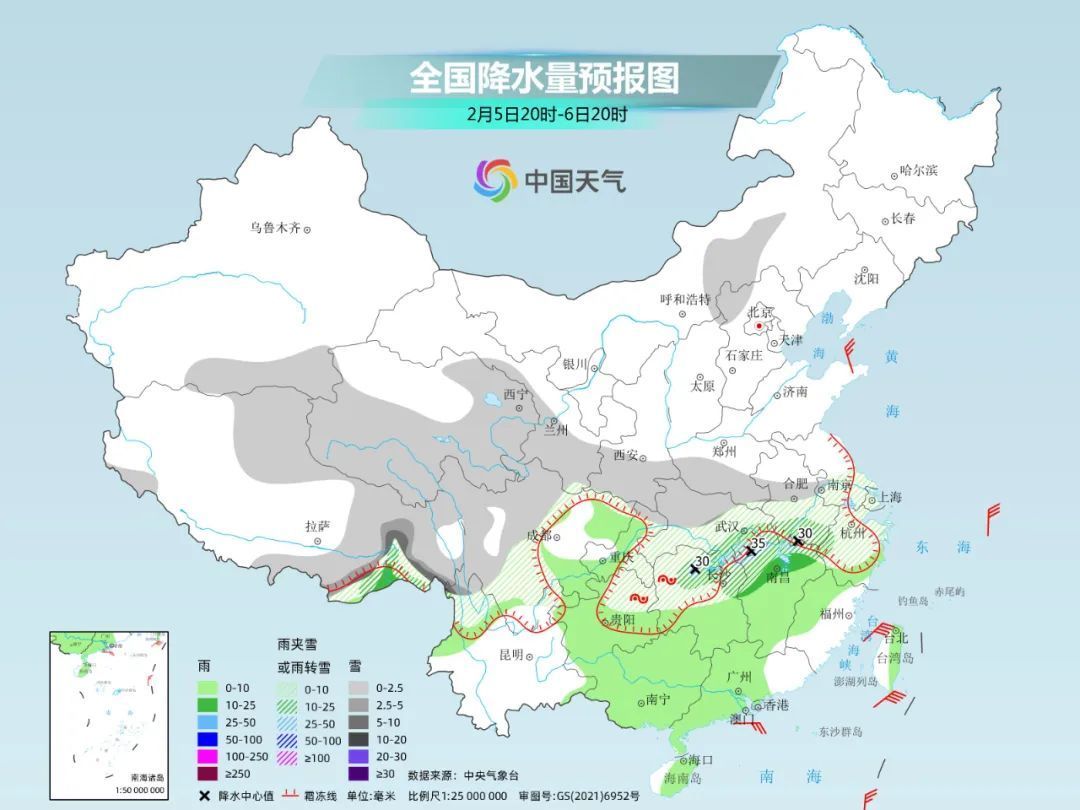 5日以后,北方地区降雪会大幅收缩、6日基本结束,但由于南方暖湿气流较为活跃,南方地区大范围雨雪天气将持续到除夕之前。