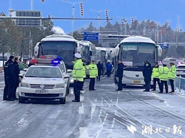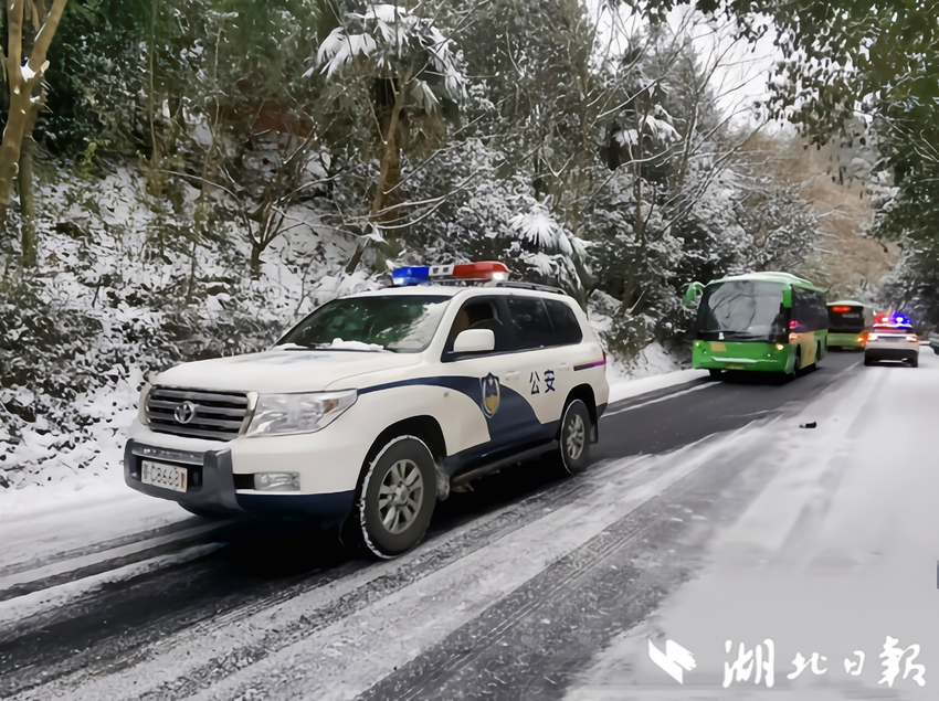 2月2日中午,武当山景区因道路结冰有游客被困,武当山交警大队联合武当山派出所调集应急车辆赶赴景区转运受困游客。下午3时,在警车的带道护送下,被困在景区的238名游客安全转运下山。(湖北日报客户端武当频道通讯员 周云 杨建波 陈霞 )