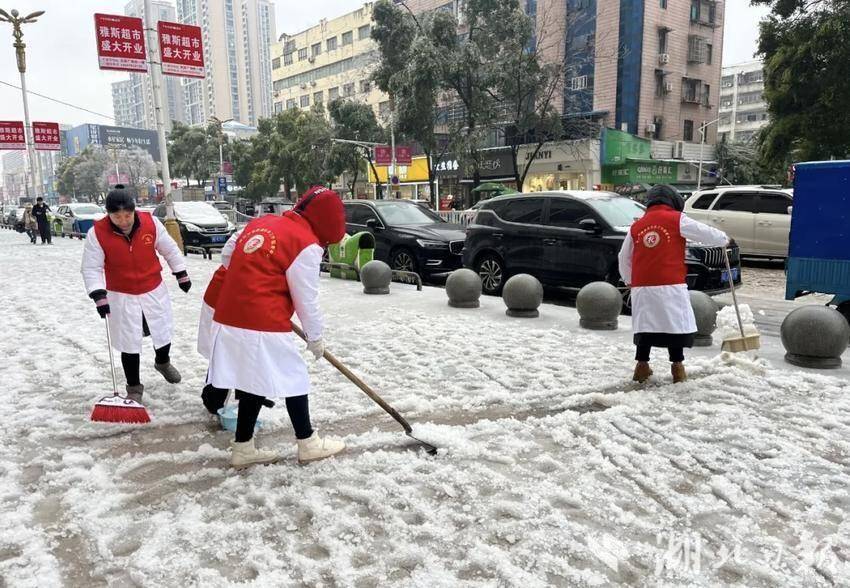 2月3日上午,监利市亮晶晶社会工作服务中心志愿者迅速集结,冒着严寒大雪在容城大道奋勇投身“战”风雪的第一线。(湖北日报监利频道通讯员 张必林 章红莉)