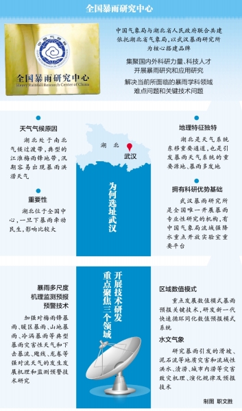 为什么选址湖北武汉?湖北省气象局科技与预报处副处长岳阳认为,主要有四个原因:一是天气气候原因,湖北处于南北气候过渡带,典型的江淮梅雨锋地带,汛期容易出现暴雨洪涝天气,每年6月份就会迎来梅雨期,必然有大暴雨过程;二是重要性,湖北位于全国中心,长江汉江横贯,一直是个险段,三峡水利枢纽、南水北调的源头都在湖北,一旦下暴雨牵动民生,影响比较大;三是湖北有比较独特的地理特征,天气系统很多是自西向东走的,青藏高原过来的天气系统东移过来,湖北是重要通道,也是引发暴雨天气系统的重要源地、暴雨多发地,暴雨研究中心设在此,开展研究有数据支撑;四是武汉拥有科研优势基础,武汉暴雨研究所长期以来是全国唯一开展暴雨专业性研究的机构,气象科研工作者在暴雨预报中做了大量的研究,积累了丰富的经验,取得了一些高水平创新成果,也有中国气象局流域强降水重点开放实验室这样的重要平台。在良好基础支撑之下,新一轮国家级院所改革中,中国气象局和湖北省政府共同谋划,在湖北武汉建设全国暴雨研究中心。
