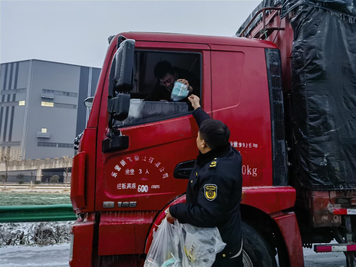 返乡司机刘先生接过“爱心包”说,大雪天走高速确实危险,都是为了我们能平安返乡。感谢你们综合执法队员的关心,为我们这些返乡人员,增添了不少温暖。