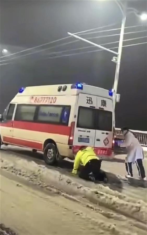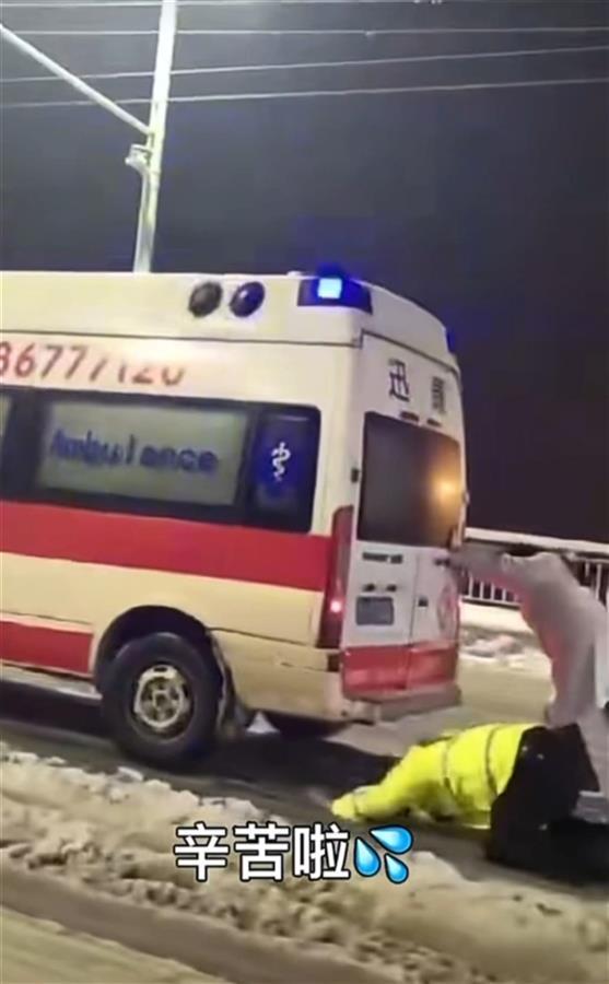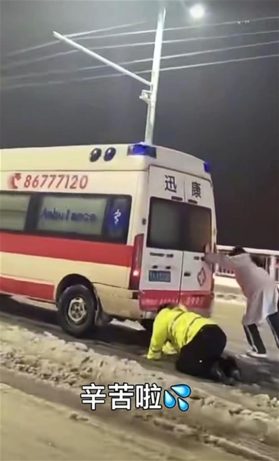 一名开车路过的市民拍下交警曹春推救护车的一幕:曹春埋头推车,谁知脚下一滑摔倒了,只是一瞬,他又连忙爬起来继续推车救援。拍摄者称:“这不管不顾的模样令人动容,交警真辛苦!”