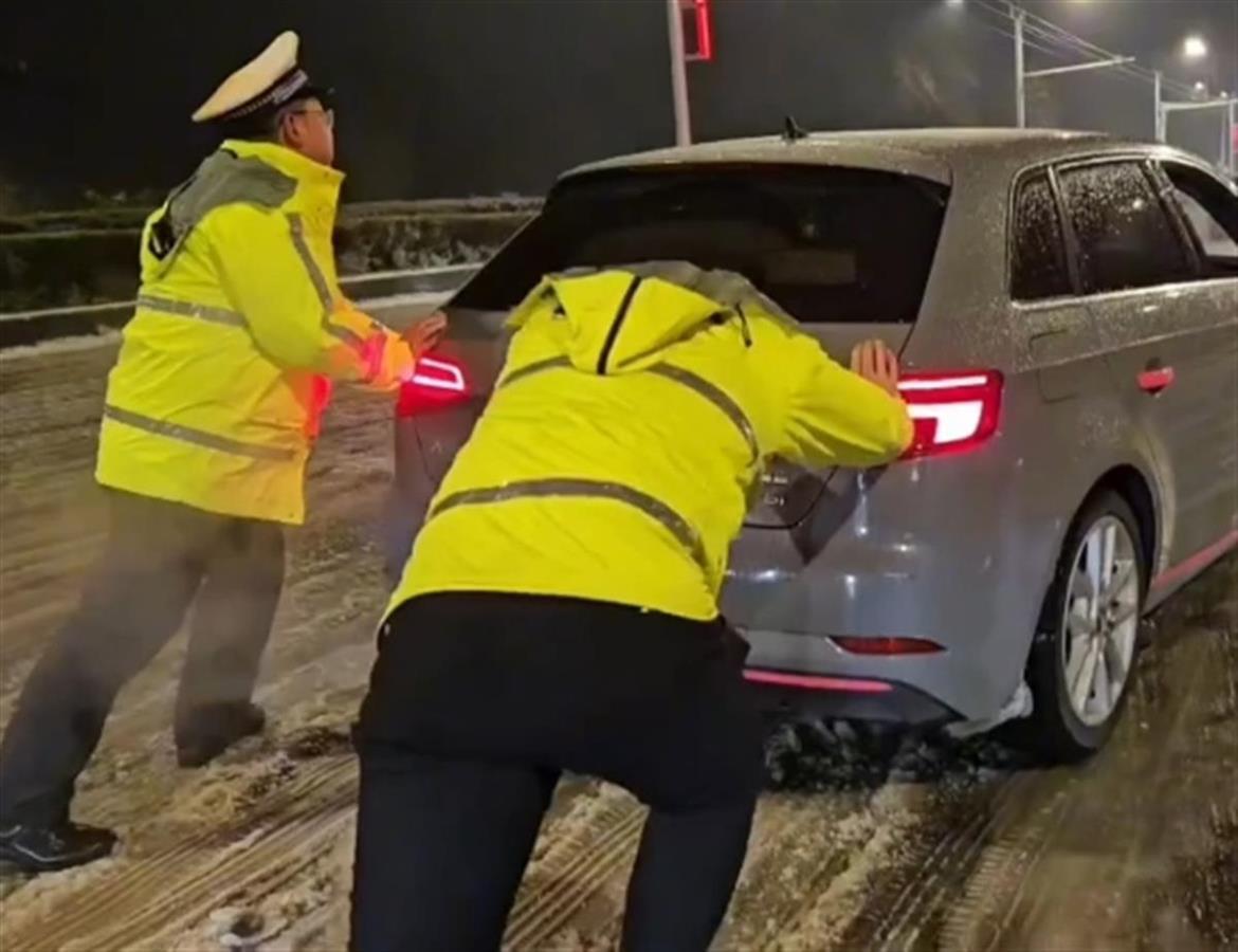 当晚,在月湖桥桥面,同样的一幕让过往群众难忘,那是民警王治、张泉带领着3名辅警,他们先后推出10多辆被困车辆。驾车群众说,得亏他们在这里帮忙,交警的坚守是暴雪里最温暖的画面。