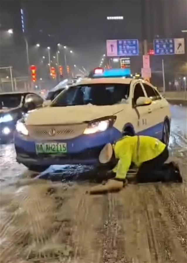 在冰雪最厚的江汉桥上桥处,硚口区交通大队民警曹春、吴玉磊找来一把铁锹和两条麻袋,一边铲冰、撒盐,一边把被困车辆推出来,遇到打滑严重的位置,曹春细心地把麻袋垫在车轮下增加摩擦力。在冰冻的路面连续推了20多辆车,衣服鞋子全都湿透了,还摔了一跤又一跤,曹春和吴玉磊累得几乎直不起腰、抬不动腿,曹春就跪在雪地里往车轮下铺麻袋。