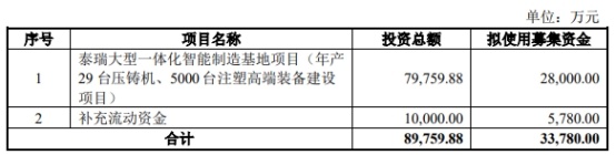 泰瑞机器于2024年1月10日披露向不特定对象发行可转换公司债券募集说明书(上会稿)。公司本次向不特定对象发行可转换公司债券拟募集资金不超过人民币33,780.00万元(含33,780.00万元),扣除发行费用后拟用于泰瑞大型一体化智能制造基地项目(年产29台压铸机、5000台注塑高端装备建设项目)、补充流动资金。