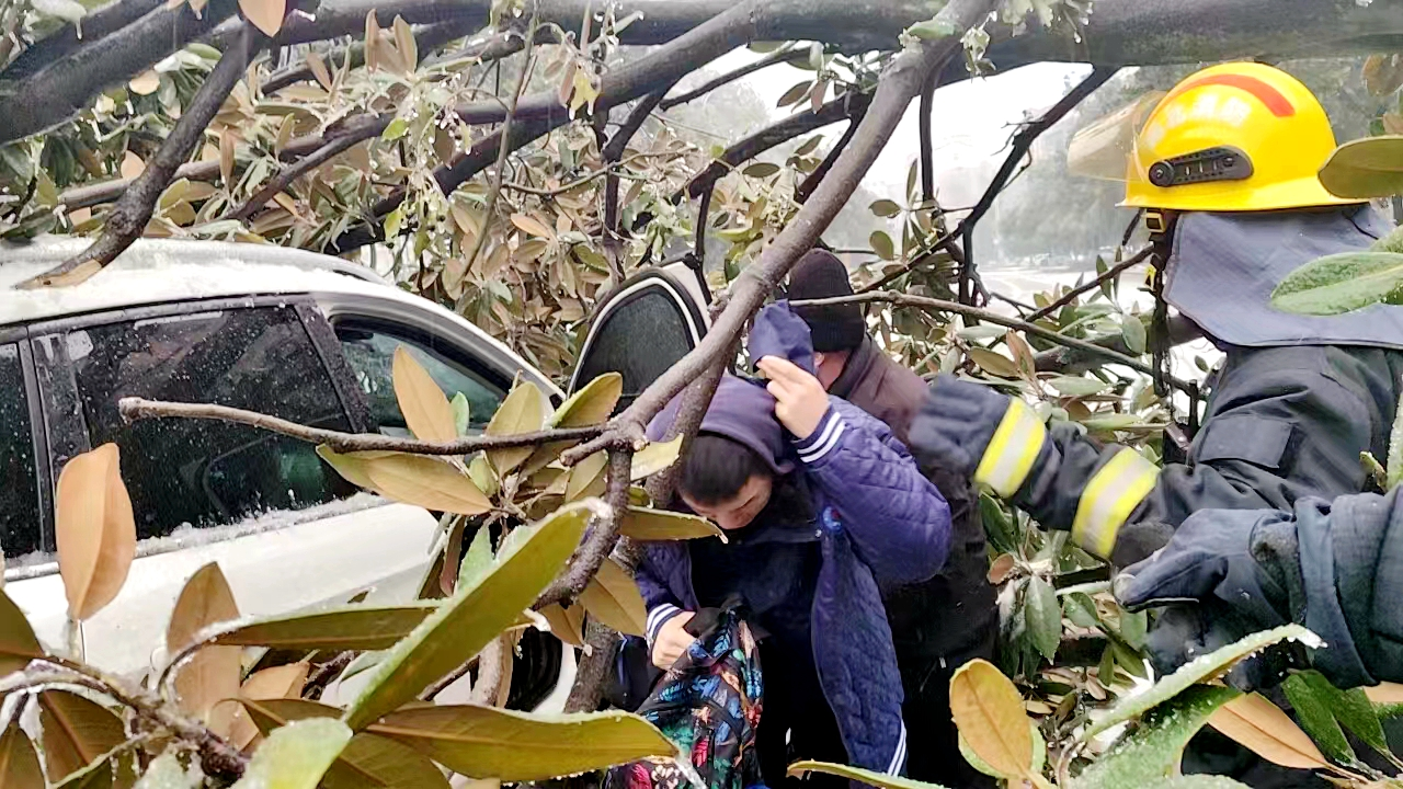 到达现场后,消防救援人员发现一辆白色轿车被倾倒的大树枝困住,由于是一夜的冻雨和积雪压断的,树枝分散,并直接压倒在树上,车被断枝包裹,车顶被压变形,车上2名人员被困,由于当时事出突然,驾驶人紧急制动,造成车上乘坐人员身体轻微撞击。消防救援人员侦查现场情况后,迅速让驾驶人和乘坐人位置上的车门是否能打开,经过尝试,发现副驾驶位车门能正常打开,随后,消防救援人员将2名被困人员救出,并护送他们到安全位置。救出被困人员后,消防救援人员随即将压断的树枝进行清理,清理过程中,消防救援人员利用抢险救援器材,对被积雪压倒的树木、树枝进行快速切除清理,对断木造成的大面积堵塞道路,消防救援人员利用机动链锯,手提肩扛,以最快的速度打通通行道路,有效的解除了安全隐患。