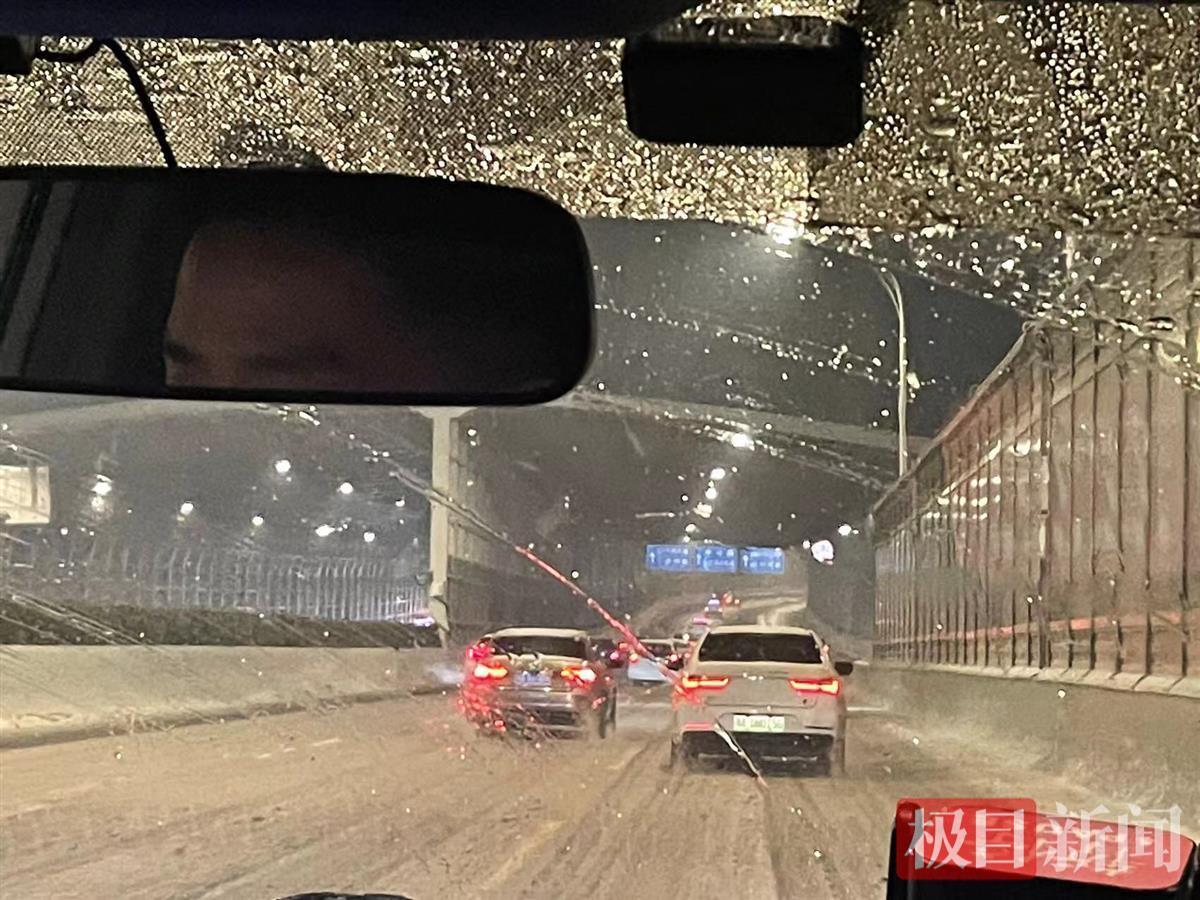 一路下着冰粒,到光谷时耗时50多分钟,而以往行车只需20-30分钟。