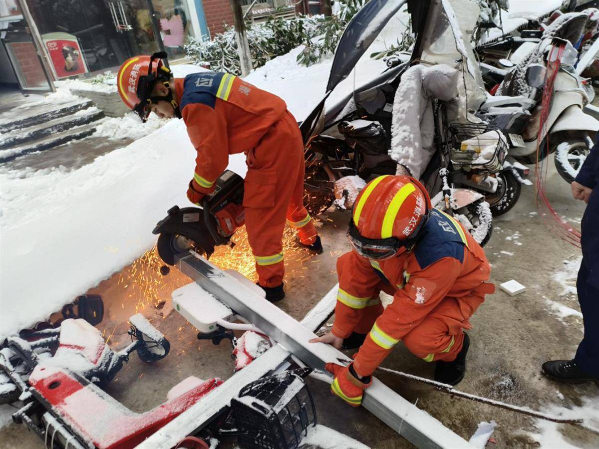 12时55分,武汉市江岸区二七人家小区内因积雪导致树木倒塌压垮一电动车棚,约40辆电动自行车被埋压。接警后,二七路消防救援站立刻出动1辆消防车和5名消防员前往处置。消防员到场后,首先利用机动链锯对倒塌的树木进行分段切割,待树干被清理完毕后,再使用无齿锯对电动车棚钢架进行切割,最后将埋压的电动自行车全部转移至安全地带。