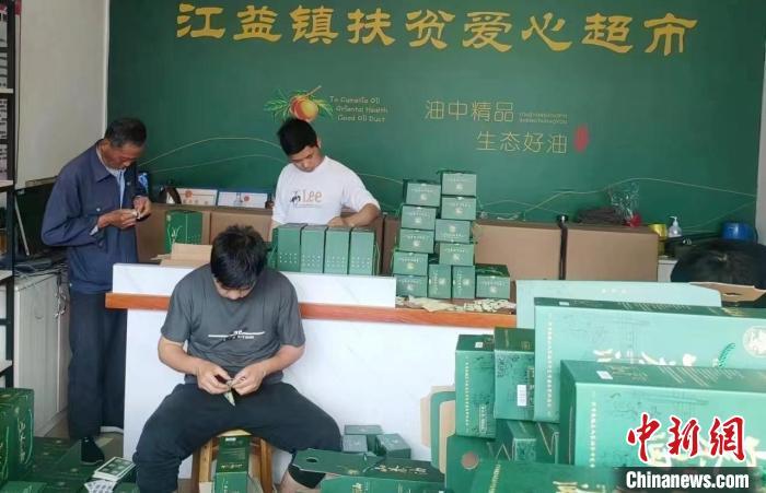 图为江西共青城市江益镇栗坂村坂上人家油茶开发专业合作社内,正在贴标签的村民。受访者供图