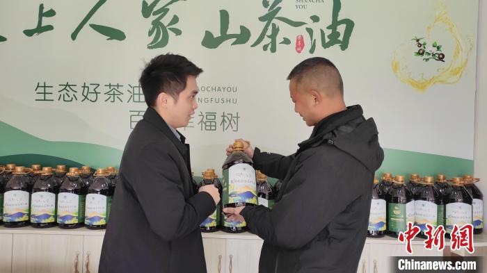 图为江西共青城市江益镇栗坂村坂上人家油茶开发专业合作社内,负责人吕晋宝(右一)正在介绍菜籽油产品。巫发阳摄