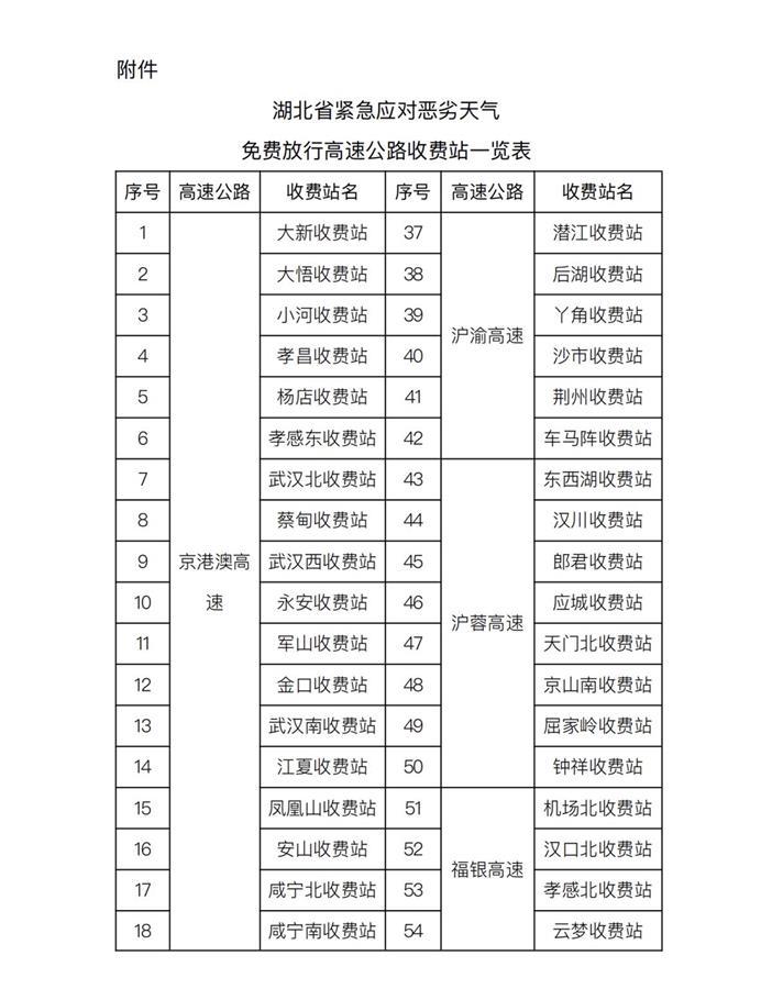 2月5日晚,极目新闻记者从湖北省交通运输厅获悉,针对近日湖北省境内部分高速公路路段因恶劣天气造成车辆拥堵严重的情况,结合最新天气预报及路网运行情况,经湖北省人民政府和交通运输部同意,调整免费放行收费站所及时间区间,自2024年2月5日20:00至6日12:00,对在指定收费站驶出高速公路的所有车辆实施免费放行。