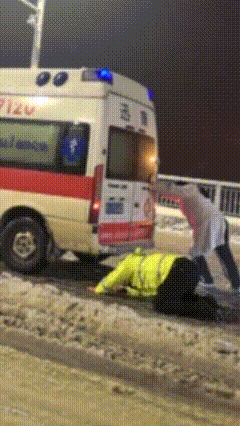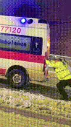 有市民意外拍下交警埋头推救护车