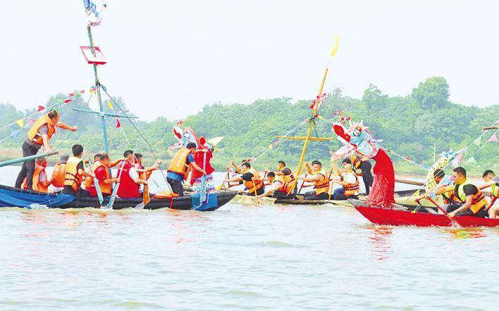穿花龙舟由一条菩萨船、一条红龙船、一条黄龙船、一条凤船组成,“舟”更是必不可少。一般在农历五月前扎制完成,农历五月初四至初九,下湖穿花游弋、夺标竞技、沿湖巡游。此前,龙舟所用之船是渔民平常使用的小木船。禁捕后,渔民交船上岸,所用之船有时租,有时村民筹资新做。