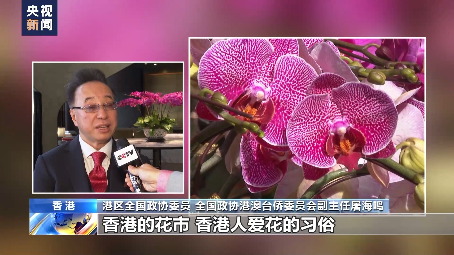 港区全国政协委员 全国政协港澳台侨委员会副主任 屠海鸣:香港的花市、香港人爱花的习俗已经由来已久,那么香港居民为什么爱花呢?在广东话里面“花”就是“发” ,许多人认为新年要有一个好意头,纷纷去买花。香港人把一年当中品花市,认为是一个重要的家庭迎新的内容。那么新的一年到了,正好是龙年,除了香港要龙腾虎跃、龙马精神,我们要不断向前、不断高升。