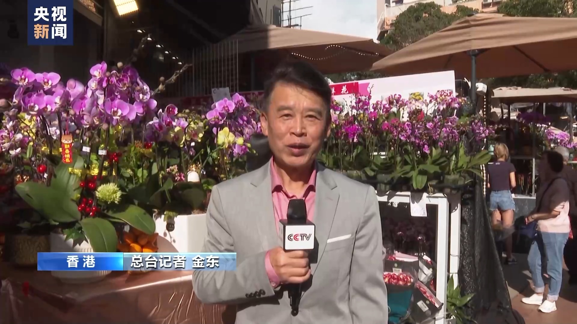 总台记者 金东:大家好,我现在是在香港的旺角花墟,这里是一个大型的花卉市场,在香港非常有名气。这里有条路的名字就叫花墟道,这条路的两旁有上百家大大小小的花店,不仅花的品种多,价格也便宜。龙年春节即将来临,现在每天都有很多香港市民来这里逛花市,买年花过春节,同时这里也吸引很多游客前来打卡。