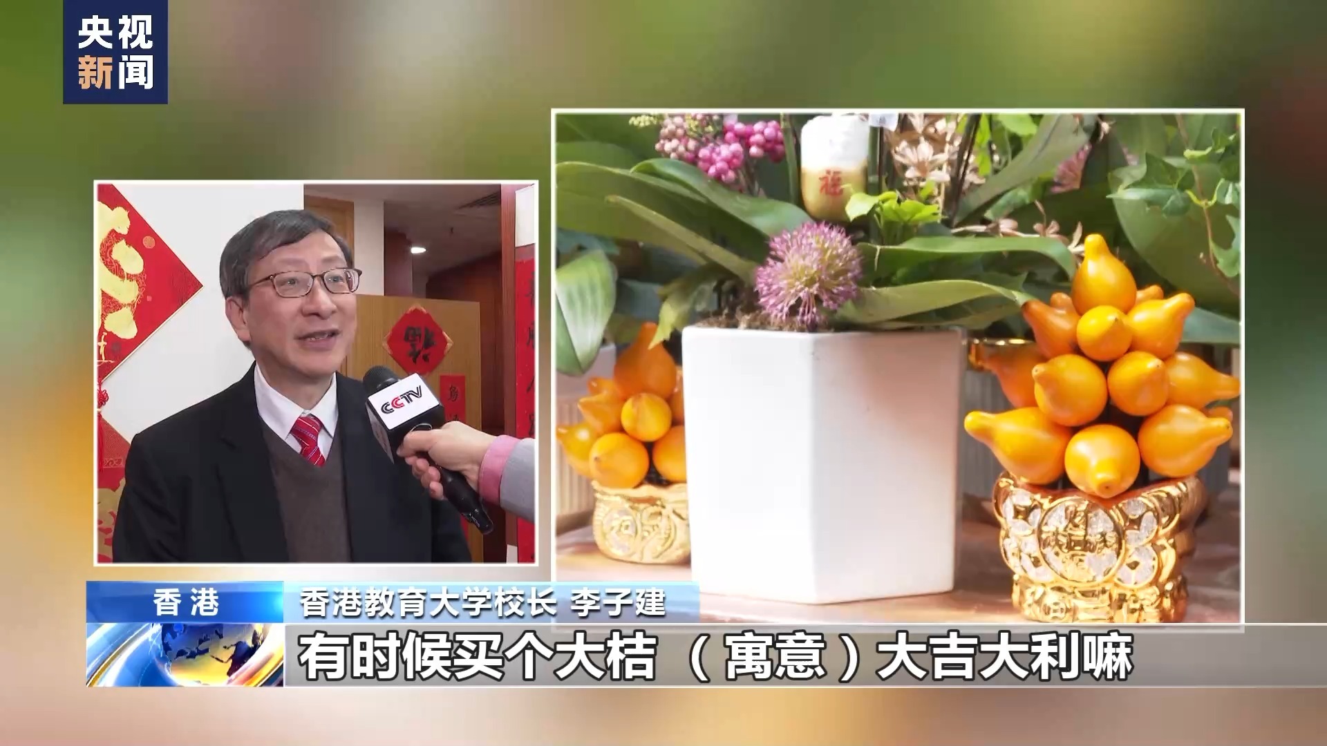 香港教育大学校长 李子建:去买花,当然有些朋友看了喜欢的花就买。我自己来说,有时候去花市,有时候买个大桔(寓意)大吉大利嘛。有时候有的朋友买梅花,桃花,这些都是很普遍的,所以要看他的喜好,但是总的来说就希望感受一下过年的气氛。我们年初可能有其他的花车巡游、烟花(表演)等等,希望今年还要开心一点。