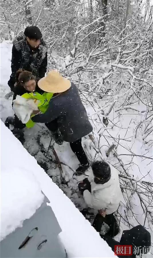 村民拍摄的视频显示,大雪纷纷扬扬,在一处高速公路的护栏外围,一名女子站在路基的斜坡上,用路政工作人员穿的反光背心将一名婴儿包裹着,蹲下身子,小心翼翼地递给下一位戴草帽的村民,10余人结成“人链”,接力将婴儿递下3米多高的路基。传递途中,现场有人不停喊着:“安全第一!一个一个地传下去,不要让宝宝被树枝给划伤了。”