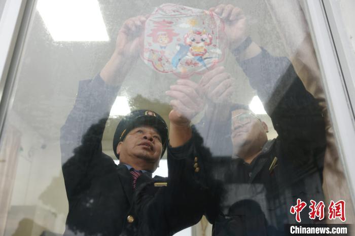 图为韦建国和同事贴窗花迎接春运。汤晓逵 摄