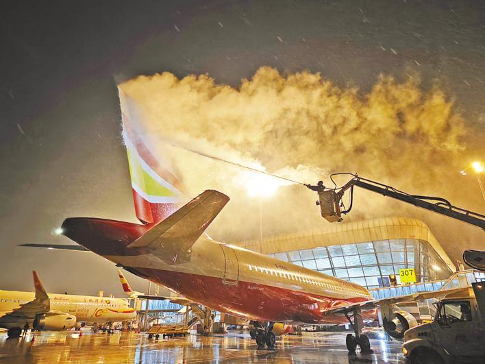 2月3日晚,武汉天河机场为即将起飞的飞机除冰。(通讯员 汪健 摄)