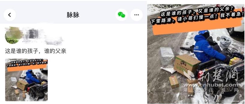 2月6日,还有湖北武汉网友拍到快递员摔倒在雪中,更是主动呼吁:请小哥们慢一点。据事后了解,摔倒的快递员是菜鸟速递武汉国博站点的许建龙,摔倒后无大碍,仍坚守在一线。