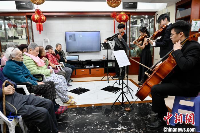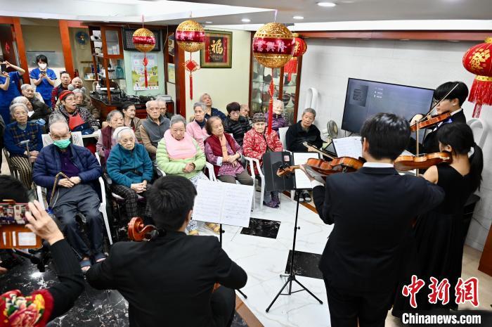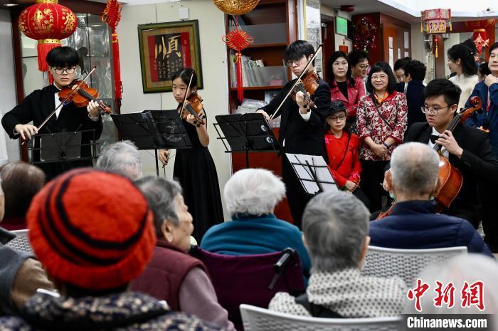2月7日,由紫荆杂志社主办的“传经典 颂中华”紫荆青少年龙年新春音乐快闪活动在湾仔一安老院举行,为一众长者演奏经典乐曲《龙的传人》《狮子山下》《我的中国心》等,并送上福袋迎接新春。