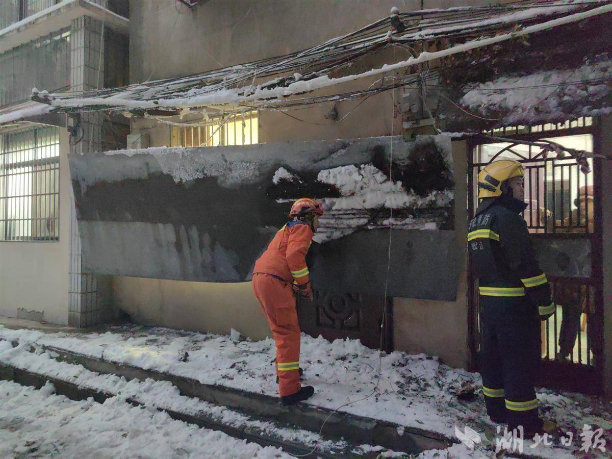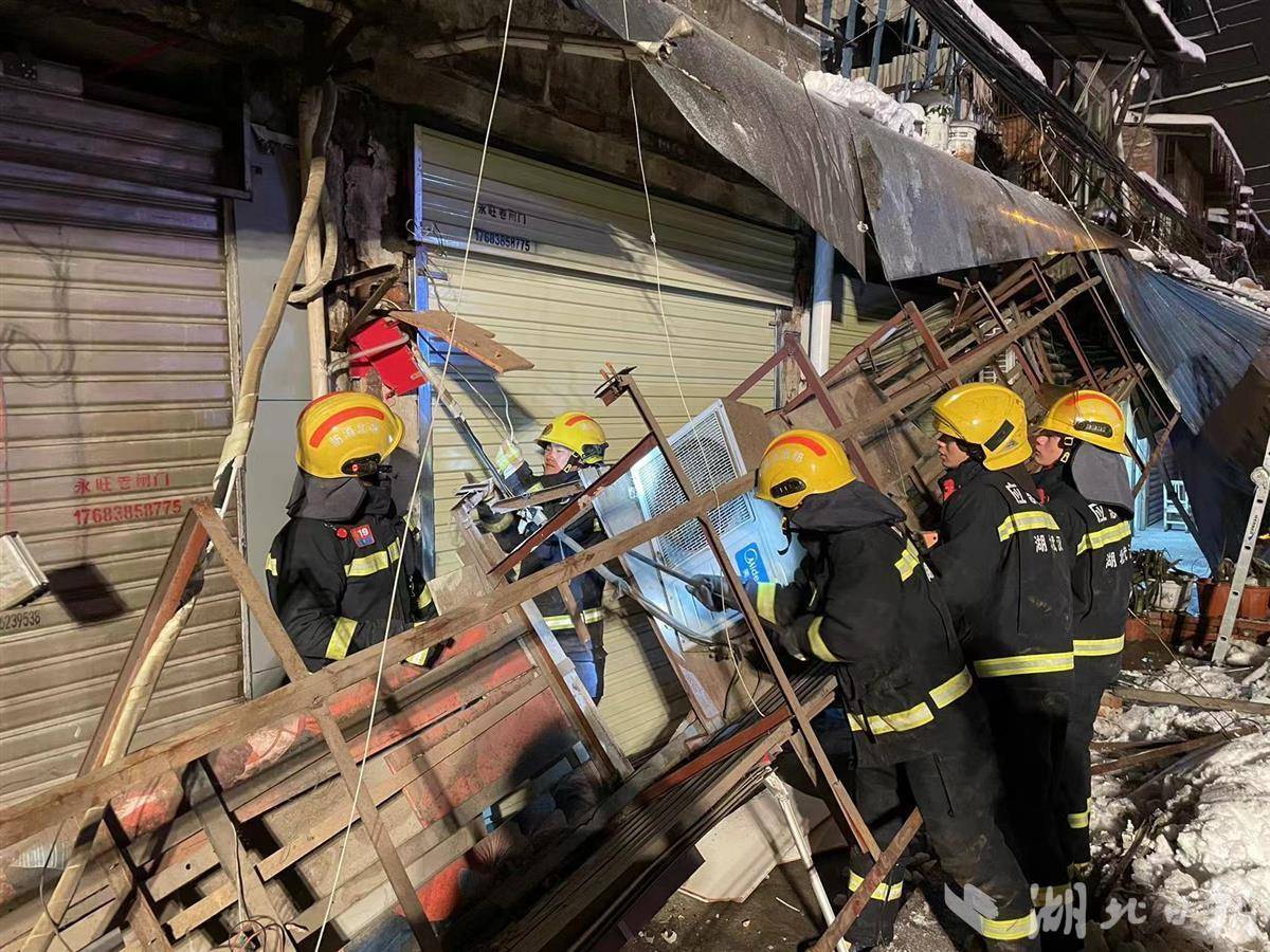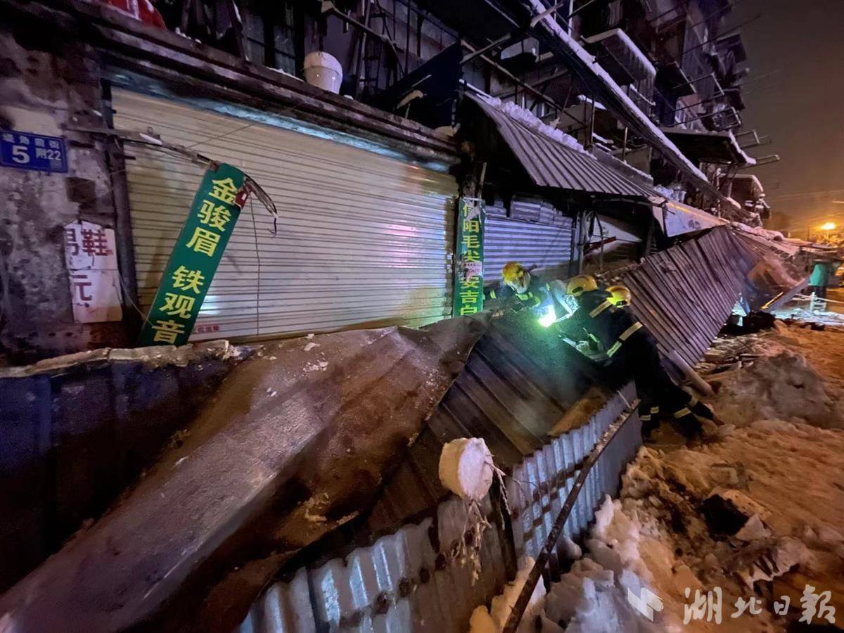 2月6日23时52分,武汉市江岸区堤角前街8附1号一排临街商铺的铁皮遮雨棚被积雪压垮后坠落至地面,十余户商铺门口被堵,两人被困在商铺内。接警后,武汉市消防救援指挥中心迅速调集岔马路消防救援站出动1辆消防车和7名消防员赶赴现场处置。