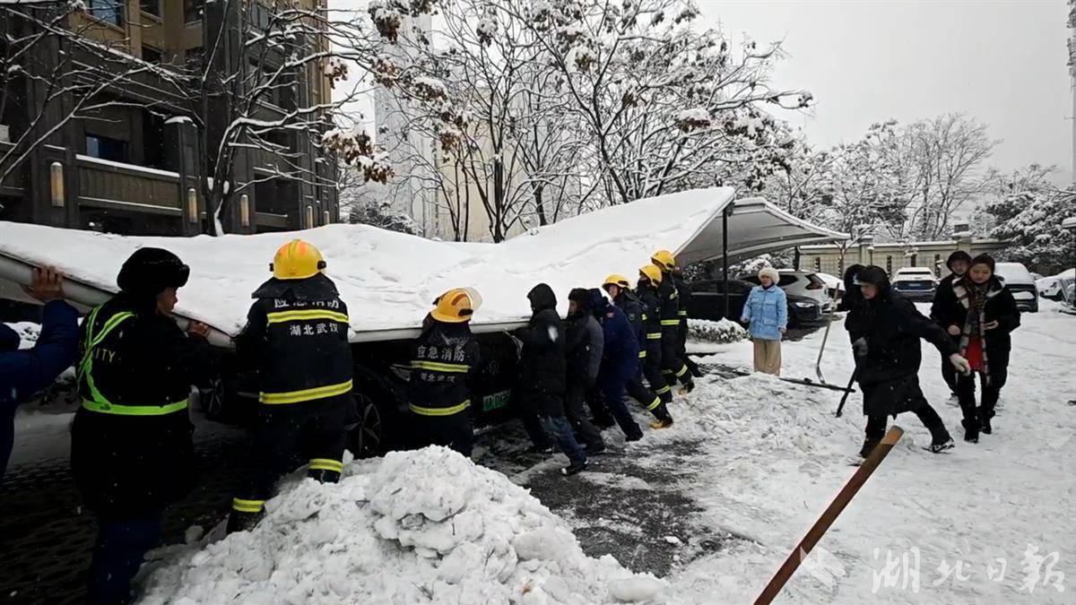 2月6日9时55分,武汉市东西湖区沿海国际中心1栋一室外停车棚因积雪被压垮,一辆私家车被埋压。接警后,新桥消防救援站立刻出动1辆消防车和7名消防员赶赴现场处置。消防员到场时发现,小区室外一遮雨棚支撑柱被积雪压垮后,整个顶部发生坍塌,停车位上一辆私家车被埋压,车内并无人员被困。因顶部积雪较厚,众人合力无法将雨棚抬起,经现场物业工作人员协调,消防员使用工具对雨棚布进行切割,再对顶部积雪进行清除,待雨棚架被抬起后,车主将车辆驶离。