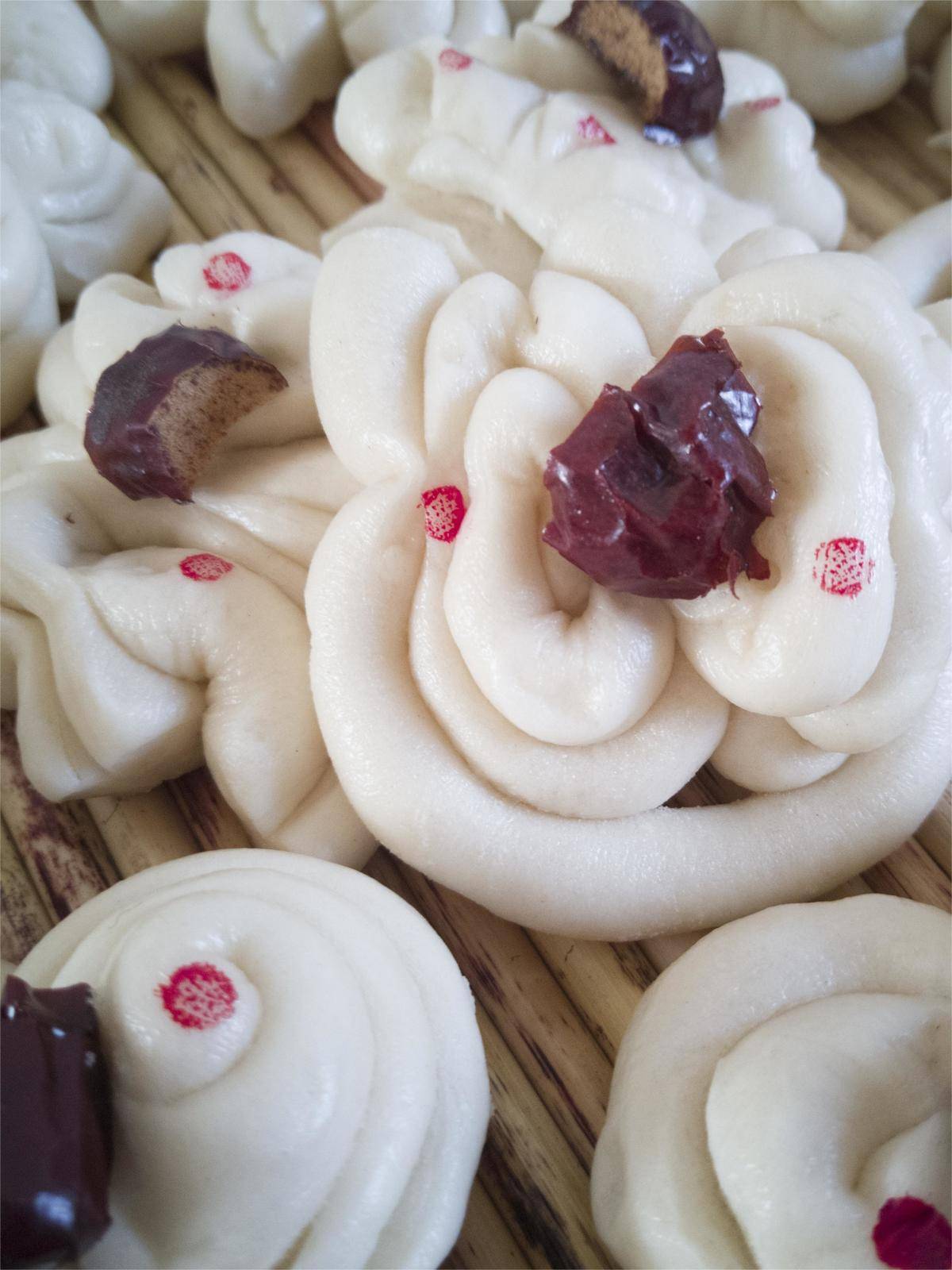 蒸好的馒头上面要点上五个红点,以示“鸿运当头”。点红点就是先把一小块儿红纸蘸上点儿水,再将五根高粱秸秆儿捆在一起,然后蘸上被水浸湿了的红纸,最后再点到即将蒸熟的馒头上面。