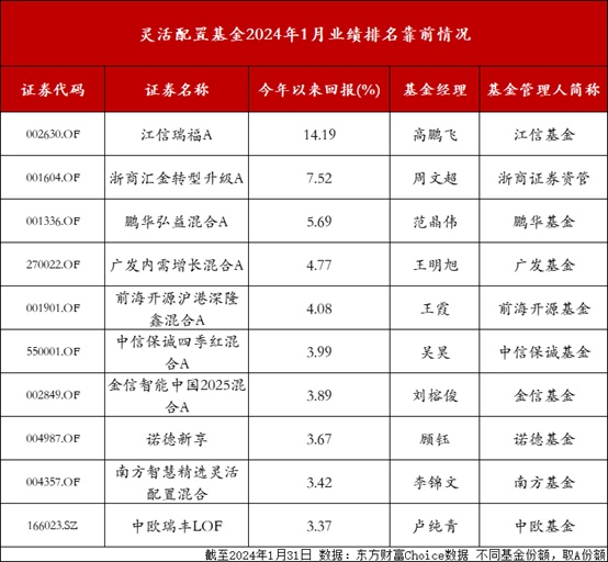 除了江信瑞福A外,同期收益率在5%以上的灵活配置基金还有浙商汇金转型升级A、鹏华弘益混合A,分别为7.52%、5.69%。另外,广发内需增长混合A、前海开源沪港深隆鑫混合A、中信保诚四季红混合A收益率分别为4.77%、4.08%、3.99%。