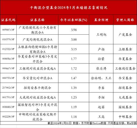 相较其他三类基金,平衡混合基金业绩表现逊色,广发稳健优选六个月持有期混合A收益最高,为3.98%,由王明旭担任基金经理。而他管理的另一只产品——广发均衡优选混合A同期收益率3.88%,排在第二名。此外,还有一只基金净值增长率超过3%,为上银鑫尚稳健回报6个月持有期混合A,而排在其后的产品回报出现断档,华夏安泰对冲策略3个月定开混合、工银绝对收益混合发起A收益率分别为1.77%、1.72%。