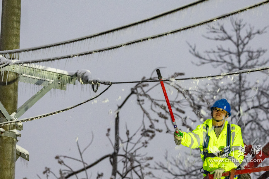 国网武汉供电公司员工对覆冰供电线路和设备进行除冰抢修。通讯员 供图