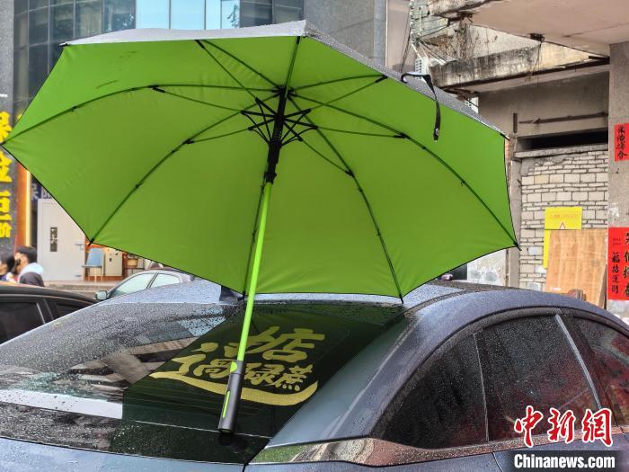 2月7日,来自江门的区女士为车后挡风玻璃上的墨宝“掂过碌蔗”撑起伞,等候风干。 曾玥 摄