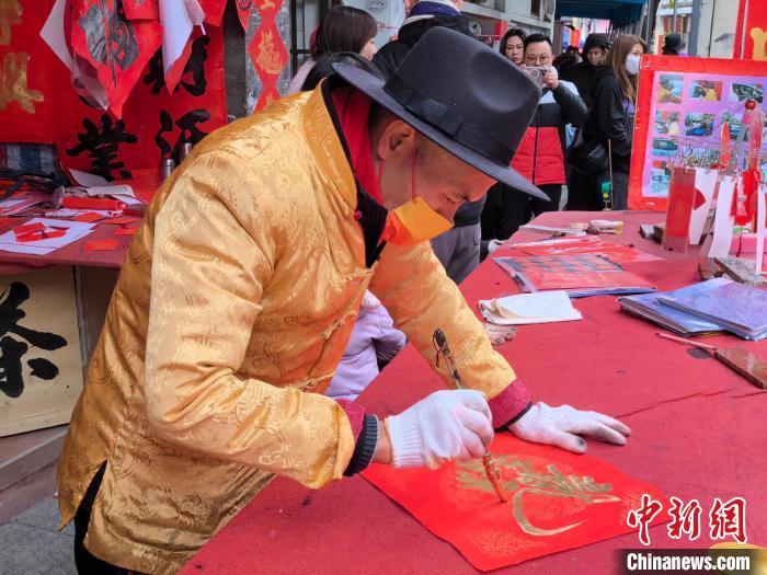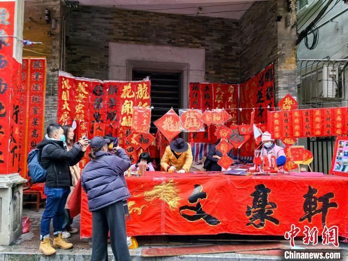 在挥春街摆摊二十余年,他坦言街道变化很大。“以前这里没那么多摊位,后来一年比一年多,形成现在‘成行成市’。今年尤其热闹,多了很多年轻人来写对联、写红纸。”